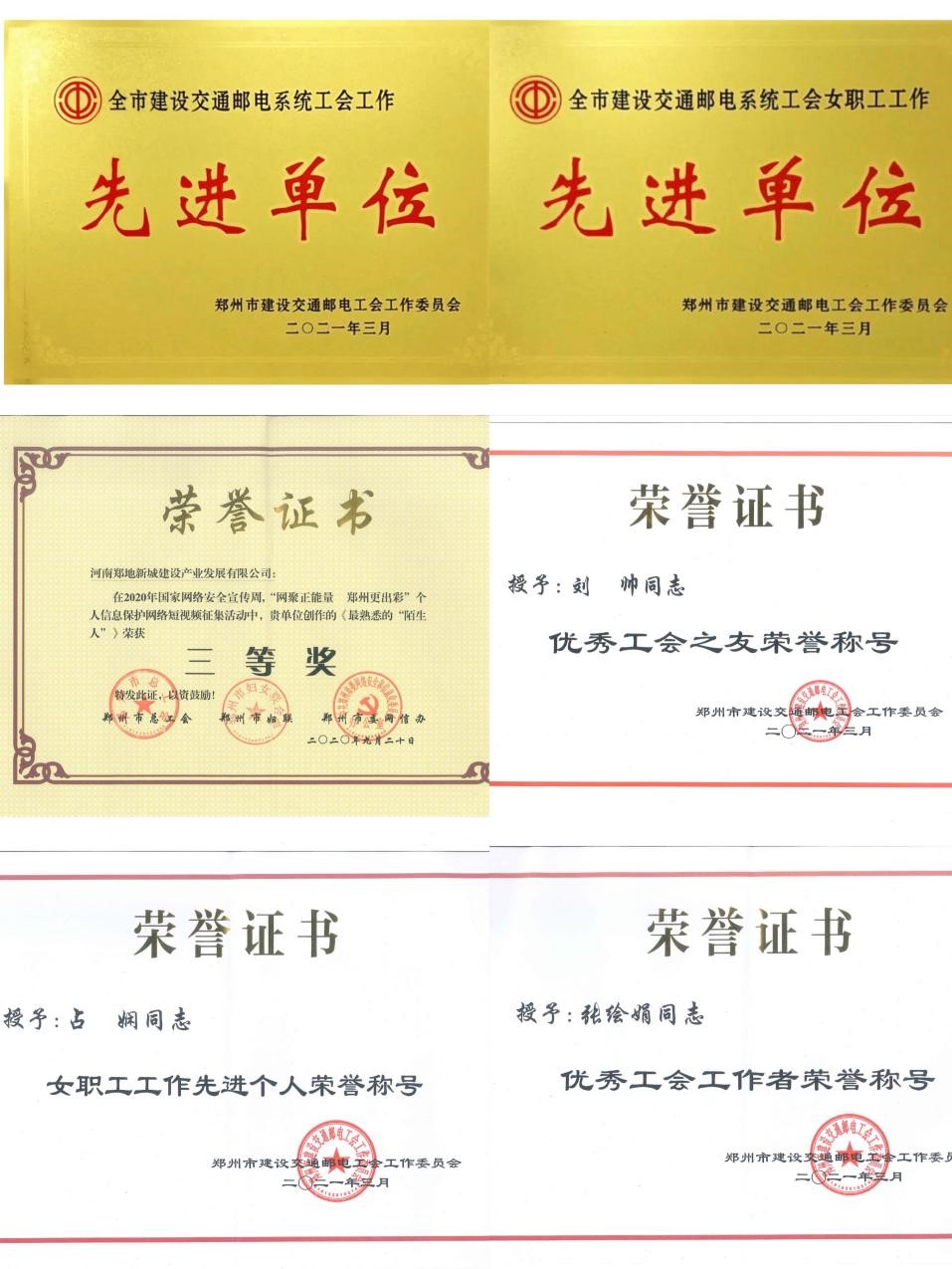 2021年3月22日,經(jīng)鄭州市建設(shè)交通郵電工會(huì)工作委員會(huì)研究決定,授予我公司工會(huì)鄭州市建設(shè)交通郵電系統(tǒng)“2020年度工會(huì)工作先進(jìn)單位”和“2020年度女職工工作先進(jìn)單位”榮譽(yù)稱號(hào),并授予劉帥同志鄭州市建設(shè)交通郵電系統(tǒng)“2020年度工會(huì)之友”榮譽(yù)稱號(hào),新城公司工會(huì)的占嫻和張繪娟兩位同志分別被評(píng)選為“優(yōu)秀工會(huì)女職工工作”和“優(yōu)秀工會(huì)工作者”先進(jìn)個(gè)人。