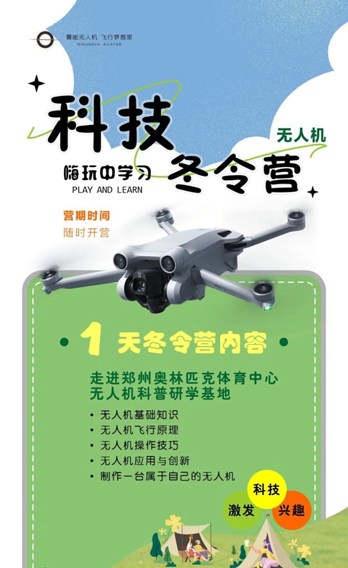鄭州奧體翼能無人機(jī)研學(xué)基地是集無人機(jī)科普、研學(xué)、開發(fā)、應(yīng)用、賽事運(yùn)營的綜合服務(wù)平臺(tái),不僅擁有1000余平方米的無人機(jī)科普教育基地,還擁有無人機(jī)駕駛執(zhí)照的培訓(xùn)資格。寒假期間,依托鄭州奧體中心開闊場(chǎng)館,翼能無人機(jī)將科普知識(shí)與實(shí)操表演完美結(jié)合,分別開設(shè)1至5天不等的科技冬令營,代領(lǐng)孩子們放飛科技?jí)?,在嗨玩中學(xué)習(xí)。
