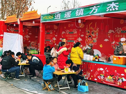春節(jié)期間正常營業(yè),全天候不間斷熬煮香噴噴、熱騰騰的胡辣湯,使美食街這家攤位成功出圈,一碗湯一張餅,日銷量高達3000份,濃濃河南特色,滿足了眾多游客的心和胃。