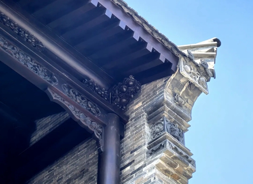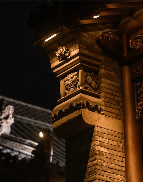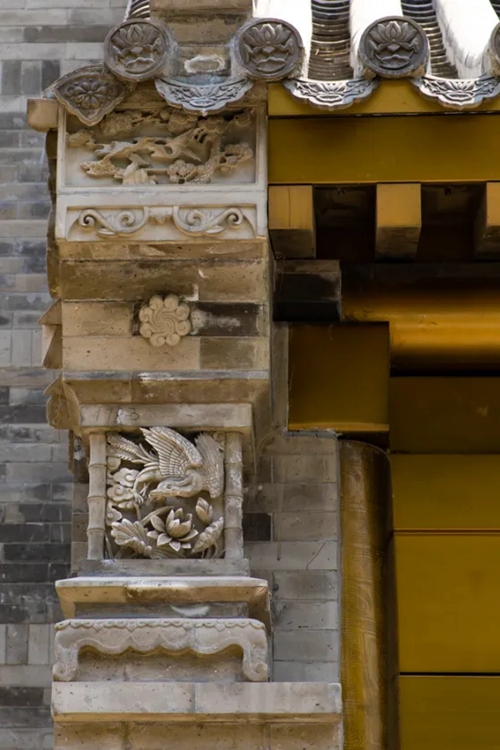 與之相對(duì)的17號(hào)樓主題為仙鶴,主題靈感來自于“仙鶴的故鄉(xiāng)”鶴壁。建筑上精美的墀頭也表達(dá)了此棟院子的主題,其上段位仙鶴,寓意松鶴延年,墀頭下端位仙鹿,寓意福祿綿長。而這處雕刻精美又涵義豐富的墀頭設(shè)計(jì)來源于河南鶴壁的古城摘星臺(tái)公園。