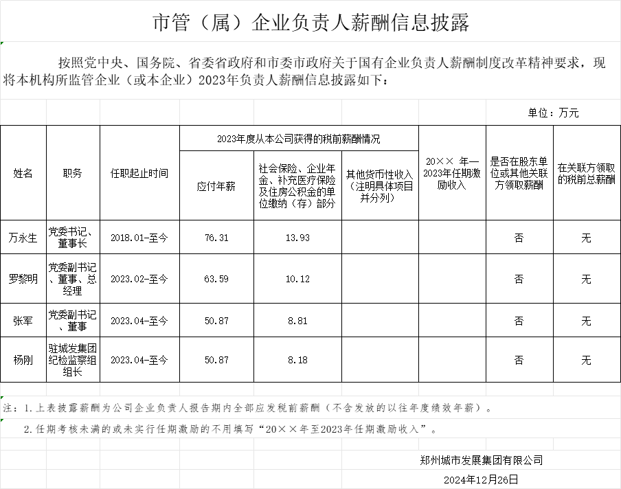 鄭州城市發(fā)展集團(tuán)有限公司2023年企業(yè)負(fù)責(zé)人薪酬情況