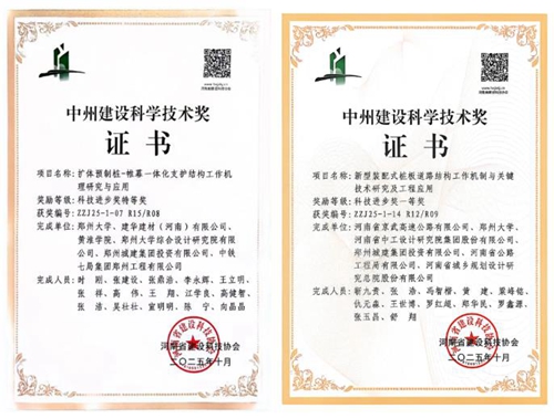 鄭州城建集團(tuán)的“擴體預(yù)制樁—帷幕一體化支護(hù)結(jié)構(gòu)工作機理研究與應(yīng)用”與“新型裝配式樁板道路結(jié)構(gòu)工作機制與關(guān)鍵技術(shù)研究及工程應(yīng)用”兩項科研項目,分獲河南省“中州建設(shè)科學(xué)技術(shù)獎”特等獎和一等獎。