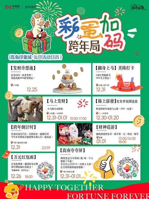 12月31日-1月3日,憑快樂幣可免費(fèi)騎小馬、抽獎(jiǎng)、兌換零食禮包,輕松實(shí)現(xiàn)童趣與味蕾雙重滿足??缒暌?,商場(chǎng)營(yíng)業(yè)時(shí)間延長(zhǎng)至23:00后自然閉店,大屏同步跨年倒計(jì)時(shí),和親友一起在歡呼聲中迎接2026,氛圍感直接拉滿!