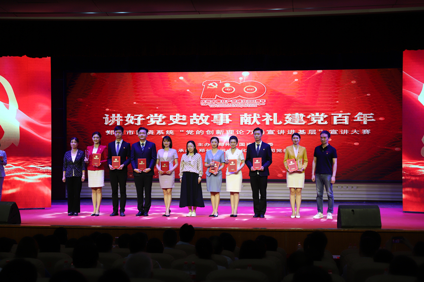 為慶祝中國共產(chǎn)黨成立100周年, 扎實開展黨史學(xué)習(xí)教育, 5月26日上午,鄭州市國資系統(tǒng)“講好黨史故事·獻(xiàn)禮建黨百年”——“黨的創(chuàng)新理論萬場宣講進基層”宣講大賽在市總工會一樓職工大禮堂圓滿落下帷幕。來自市國資系統(tǒng)14家單位選送的15個宣講節(jié)目進入大賽決賽,鄭州地產(chǎn)集團選送的西流湖公司黨支部宣講節(jié)目《百年交響》榮獲三等獎。